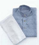 Classic blue kurta with elegant rose gold buttons, paired with a crisp white pajama. Soft, breathable magic cotton blend for allβday comfort and festive charm.