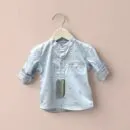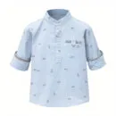 A stylish mandarin-collar shirt in soft azure blue with subtle prints — tailored in cotton satin lycra for comfort and a refined look.