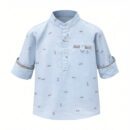 A stylish mandarin-collar shirt in soft azure blue with subtle prints β€” tailored in cotton satin lycra for comfort and a refined look.