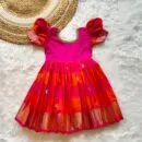 Bring timeless elegance to your little princess’s festive wardrobe. This stunning frock features the classic Paalum Pazhamum checks in semi Kanchipattu silk, with rich zari borders and puff sleeves. The soft cotton lining ensures all-day comfort while keeping the royal look intact.