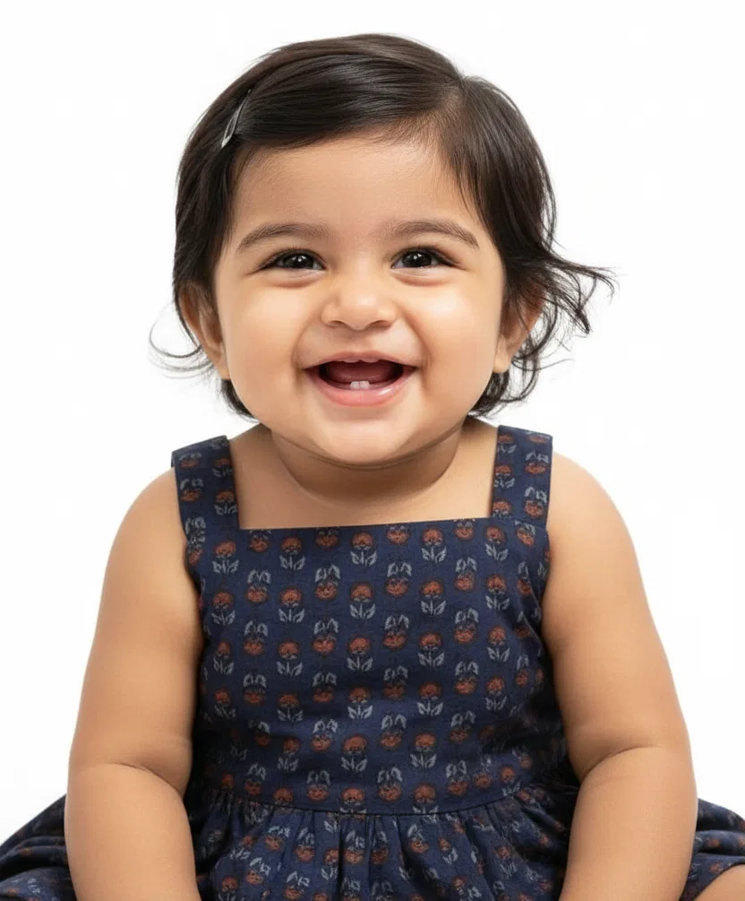 A classic navy cotton dress adorned with delicate floral prints. Its timeless charm and breezy comfort make it a versatile pick for both casual outings and special occasions.