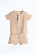 Crafted from 100% certified muslin cotton, the Sandstone Safari Set is designed to keep your little explorer cool and comfy. Keeping it cool, clean, and classic this is—a breezy, buttoned-up combo made for gentle days and toddler drama. Woven from super-soft, gauzy cotton in a warm beige tone, this relaxed-fit set features a short-sleeve henley top and drawstring shorts with just the right amount of rustic charm.