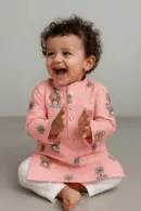 A royal touch in every stitch. This pastel pink kurta, adorned with intricate woven patterns and elegant prints, is perfect for festive occasions. Lightweight, breathable, and stylish — it blends tradition with modern charm for your little prince.