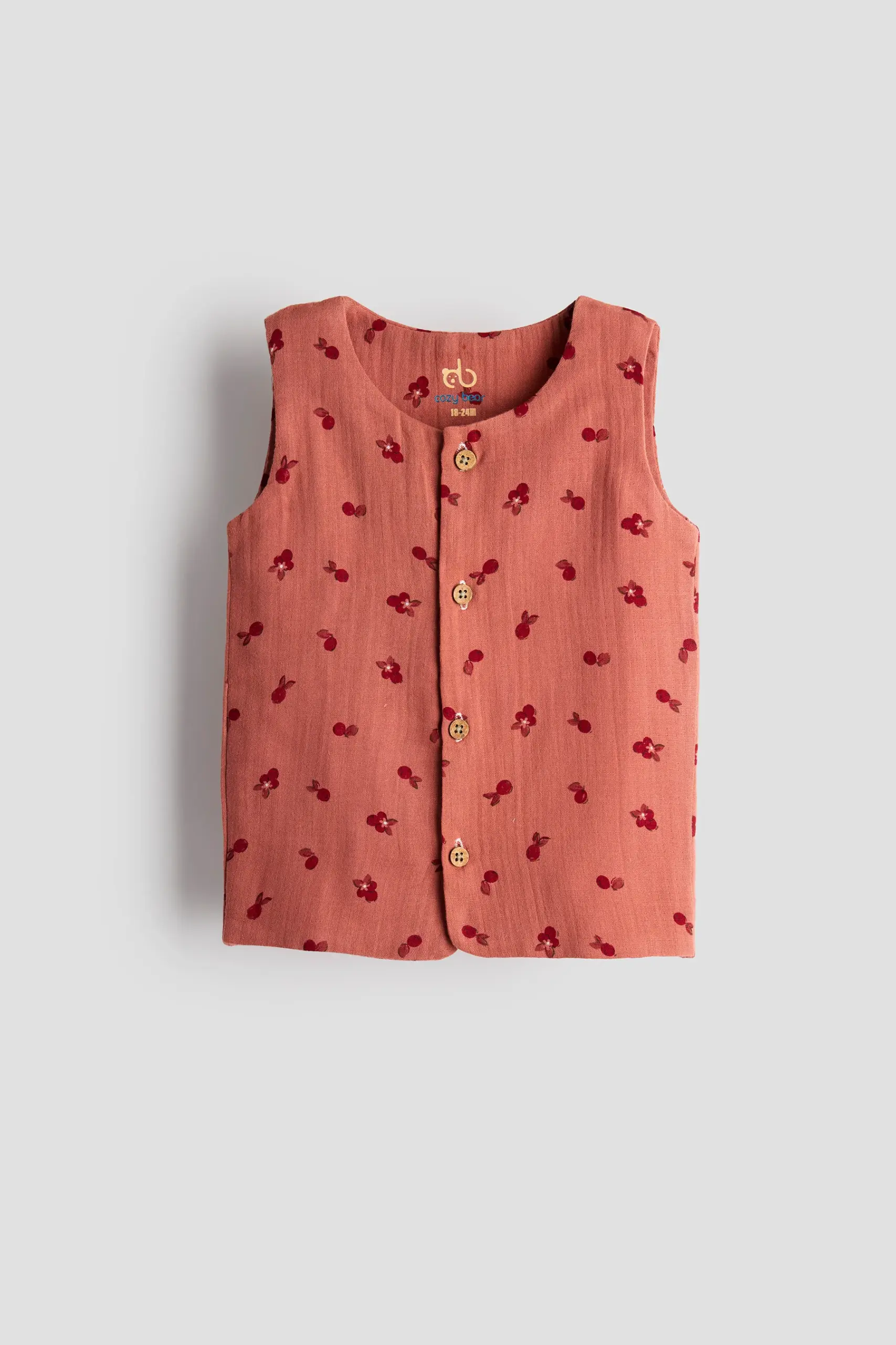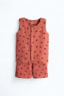 Sweet, soft, and made for sunshineβour Cherry Picked Set is a sleeveless wonder with matching shorts that scream βsummer picnic, but make it fashion.β With playful red cherry and floral embroidery on a warm terracotta base, this unisex outfit brings vintage vibes to the modern baby wardrobe.